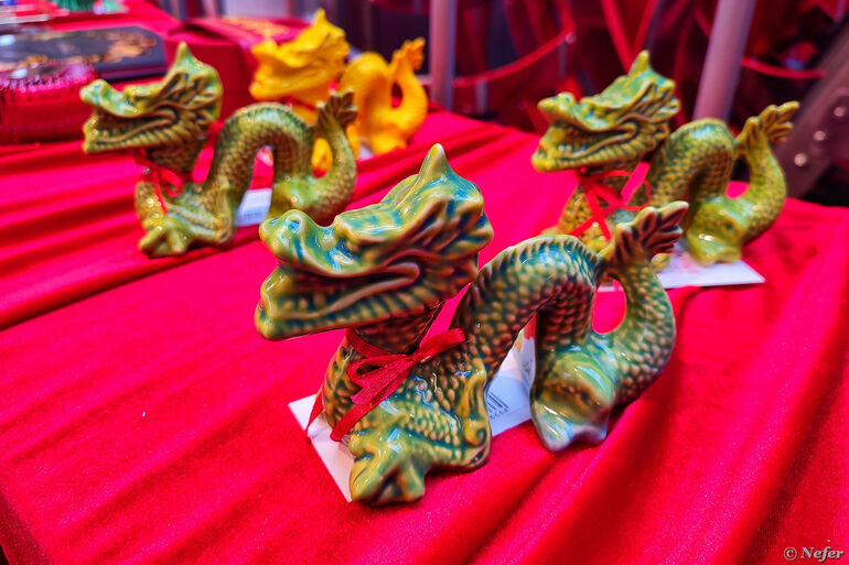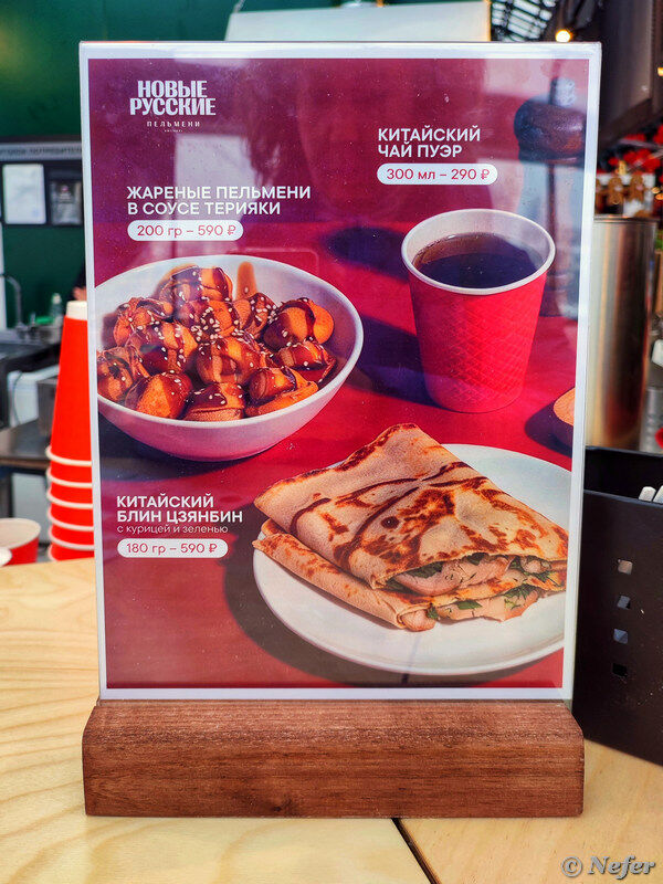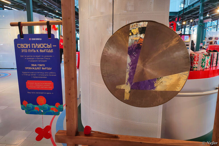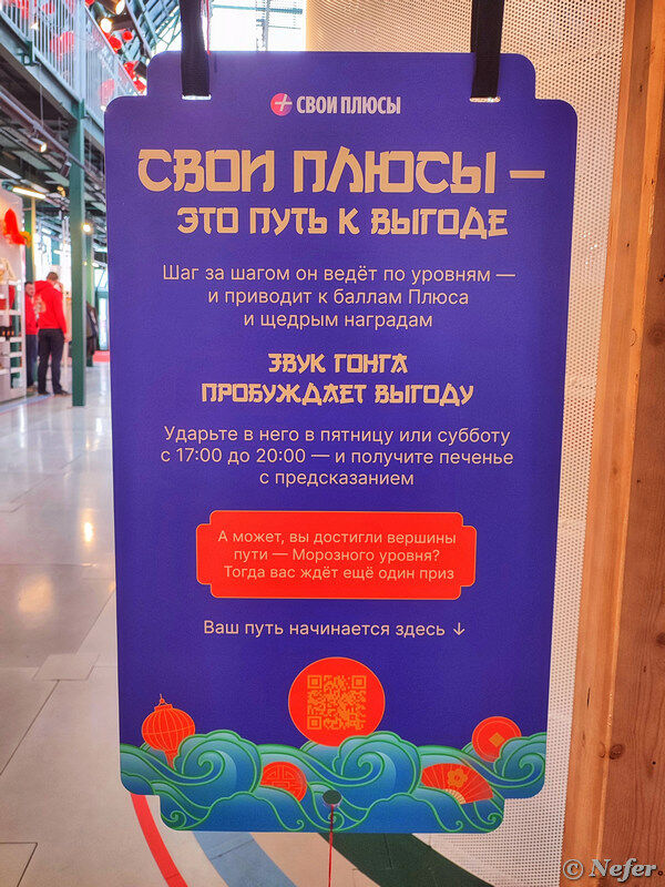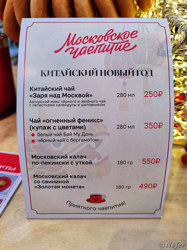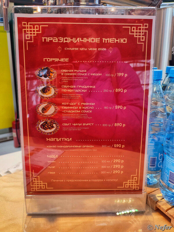 Убранство павильона дополнили китайскими фонариками и красными гирляндами. Получилось вполне празднично. Однако, скромнее, чем в прошлом году. На первом этаже зона с сувенирами и символами Нового года, а на втором - фудкорт, где помимо основного меню представлены специальные праздничные позиции.