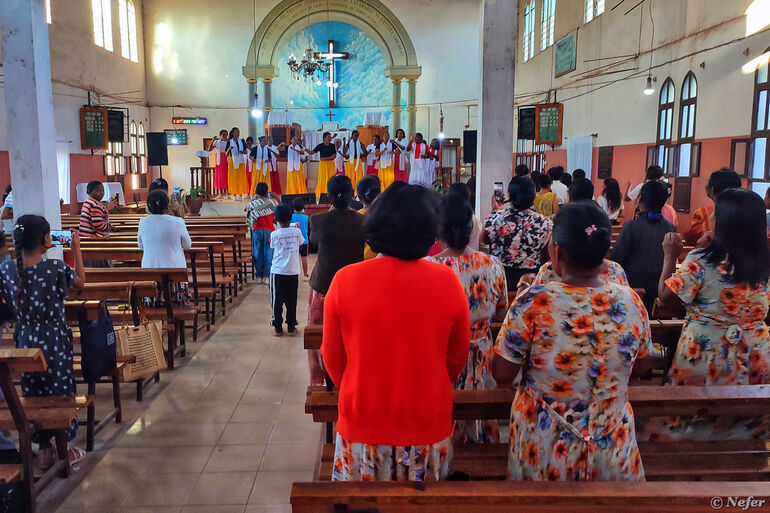Прошлись по улице от начала до конца. Услышали музыку. Пошли на звук, оказалось, в церкви служба. Осторожно заглянули, непонятно, можно входить или нет. Нам сразу замахали, мол, заходите, заходите, садитесь. Двигаются, место освобождают. Обратите внимание, несколько тетушек одеты в одинаковые платья. Это семья или может хор?