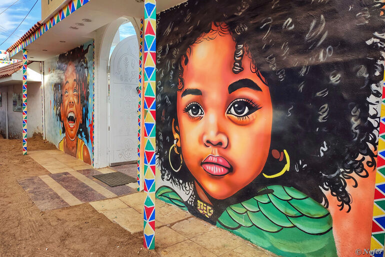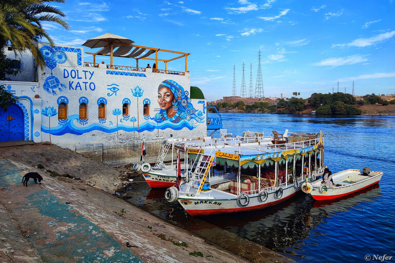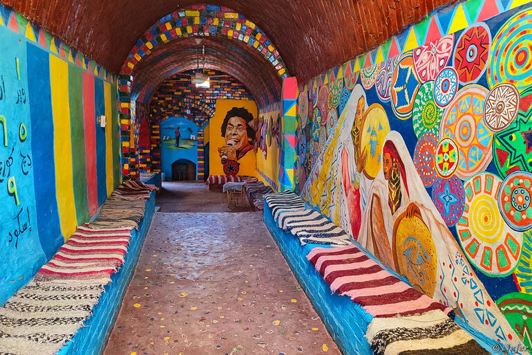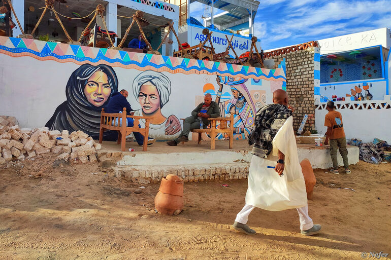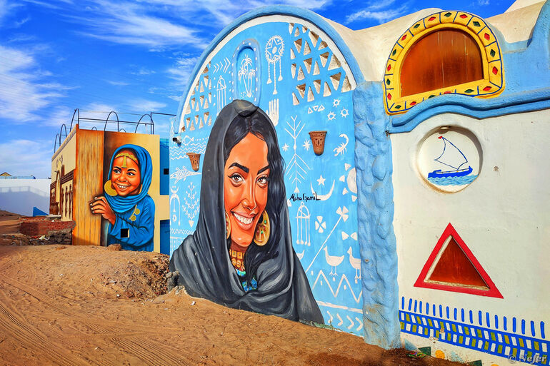 Нубийцы ярко раскрашивают свои дома. Слышала мнение, чтобы отличаться от арабов и берберов. Здания, имеющие отношение к туристической отрасли (отели, хостелы, кафе, рестораны) расписаны более заметно. В нубийской деревне много муралов, причем хорошего качества.