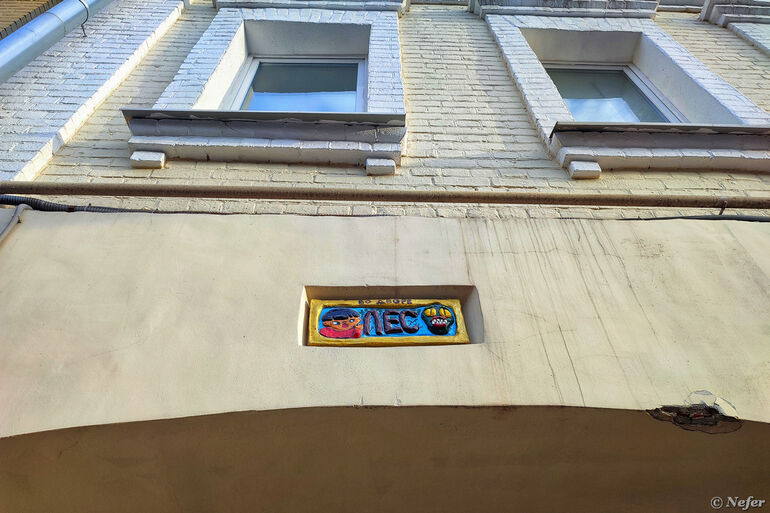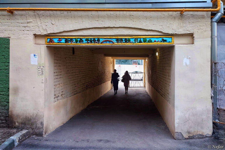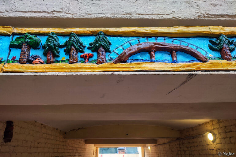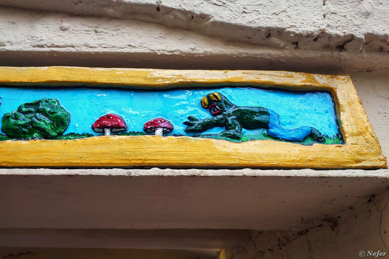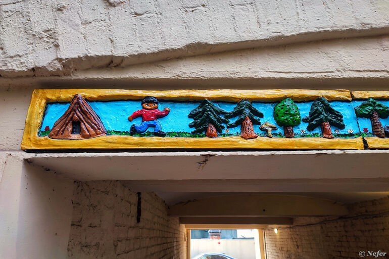 Вид со стороны двора. Это творчество команды БАТО из Улан-Удэ. БАТО - Бурятский Андеграунд Творческое Объединение. Художники создают барельефы с изображением персонажей из буддийского эпоса. Чаще всего это мальчик, который стал символом объединения, его так и зовут - Бато, а также монстр в виде гигантской рептилии. Подобные барельефы встречаются во многих городах России и даже за рубежом. Сюжеты разные: то Бато лезет на Эмпайр-Стейт-билдинг, то предстает в виде карточного Джокера, то в гусарском наряде. Здесь вот лес.
