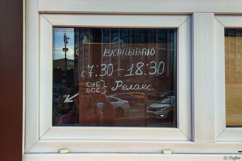 На углу Валовой улицы и Большого Строченовского переулка кофейня с непонятным для меня названием "Кофе по ходовой". В окошке забавная табличка с режимом работы.