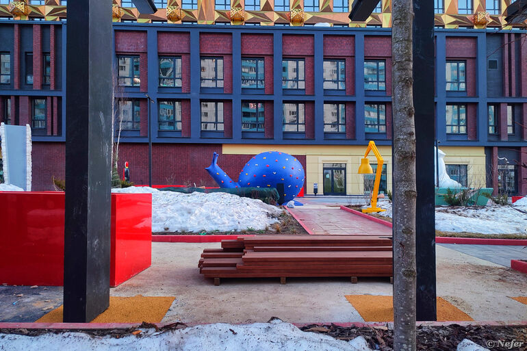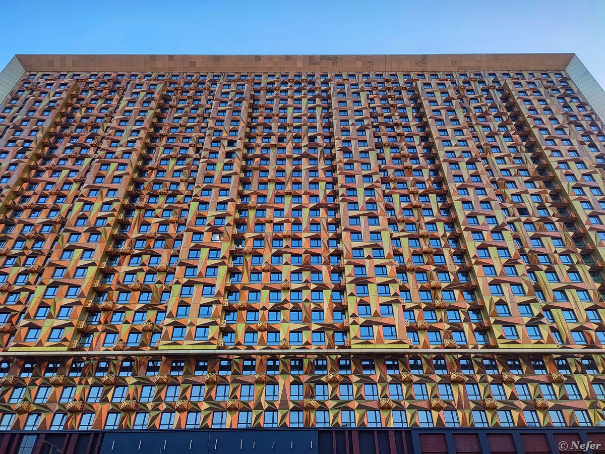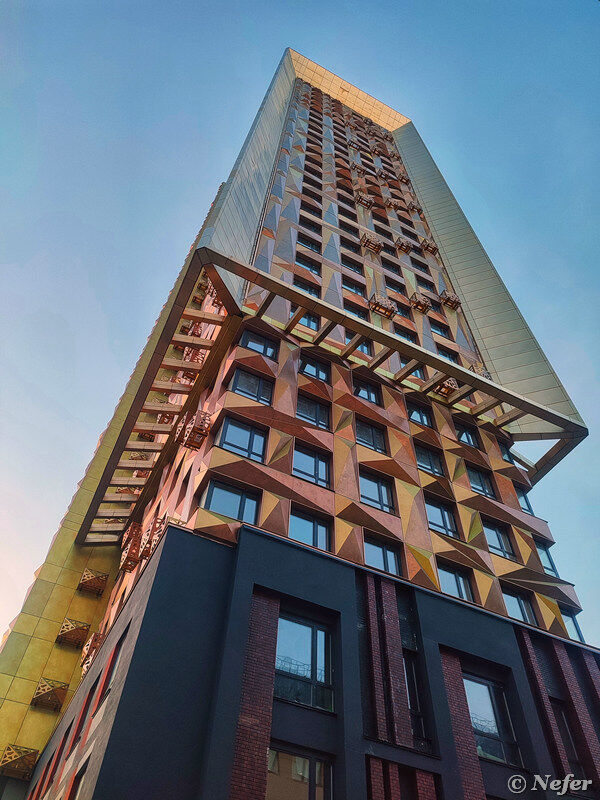 Согласование фасада шло очень долго. Дом уже вовсю строился, квартиры продавались, но никто не знал, что получится в итоге. Элементы фасада собирались прямо на месте, как конструктор. Рамки сделаны из нержавеющей стали с покрытием из нитрида титана с индивидуально разработанным оттенком. Панели несколько раз перезаказывали, то цвет не тот, то размер не подходит. А жители все ждут.