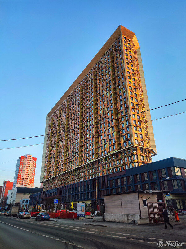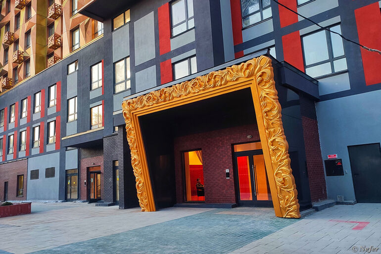 На картинках застройщика был нарисован черный квадрат в раме и надпись MALEVICH. Честно говоря, я думала, что дом будет выглядеть именно так. Было любопытно, как будет реализовано изображение черного квадрата на фасаде. Все оказалось проще, это была просто интрига. Дом строили около семи лет, а проект показали лишь недавно, за несколько месяцев до срока сдачи объекта. Теперь на Отрадной улице стоит золотая стена.